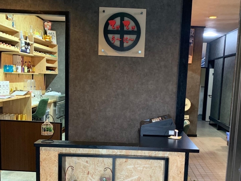 ☆カウンター壁部の棚、お店のロゴをイメージした